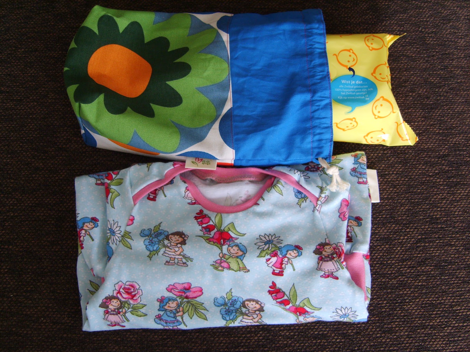 Het kruippakje gaat mee het zakje in om zo als cadeau te geven, later kan het zakje gebruikt worden als pamperzakje want ik maakte het net groot genoeg om er vochtige doekjes en wat pampers in weg te bergen.